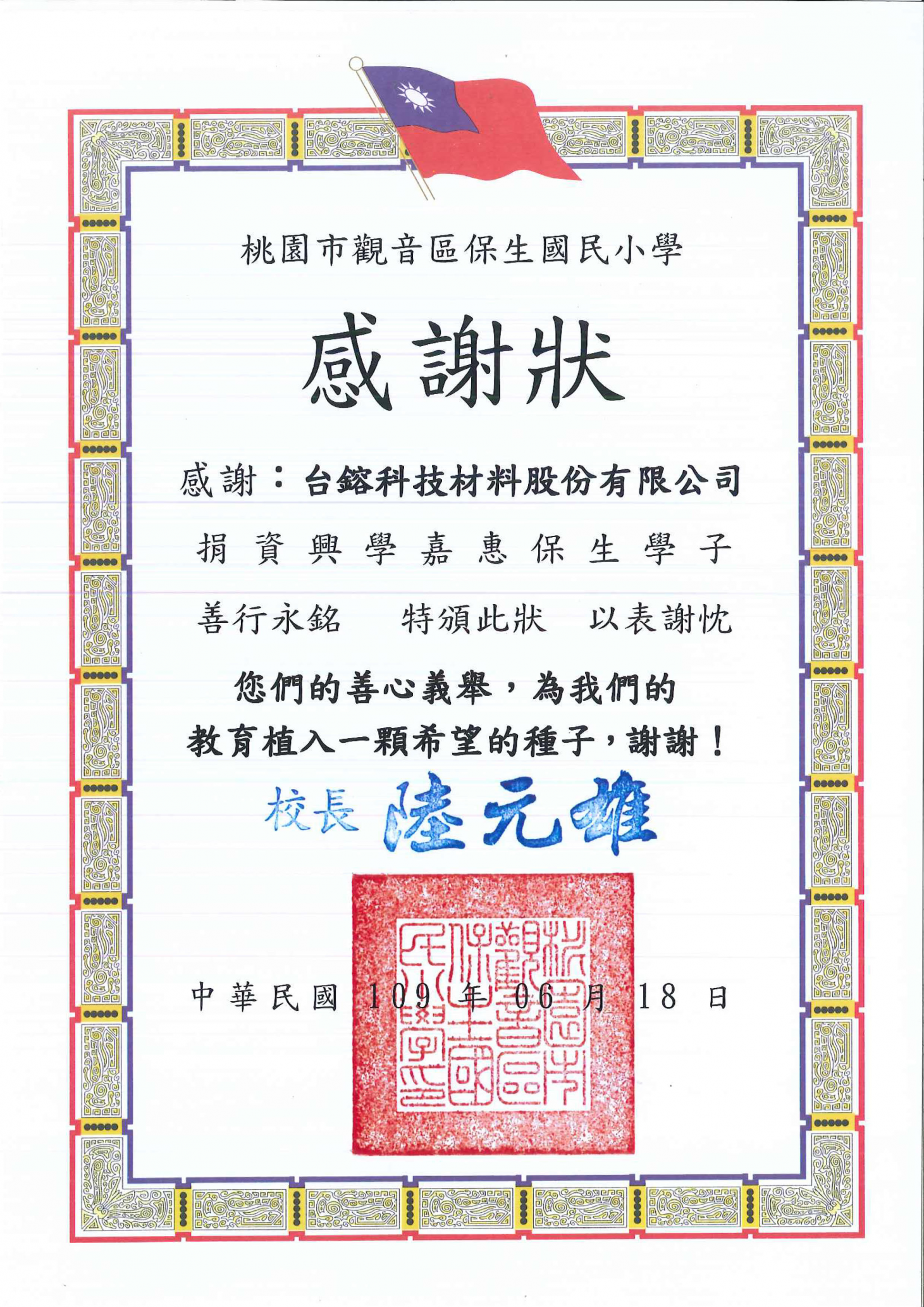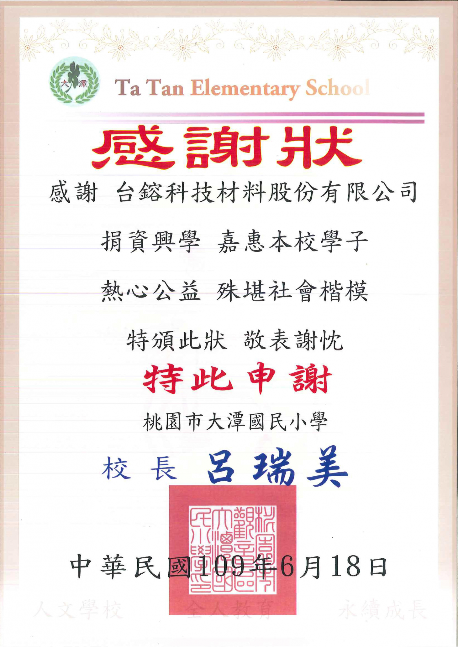 捐資協助新竹縣仰德中學獲該校感謝狀